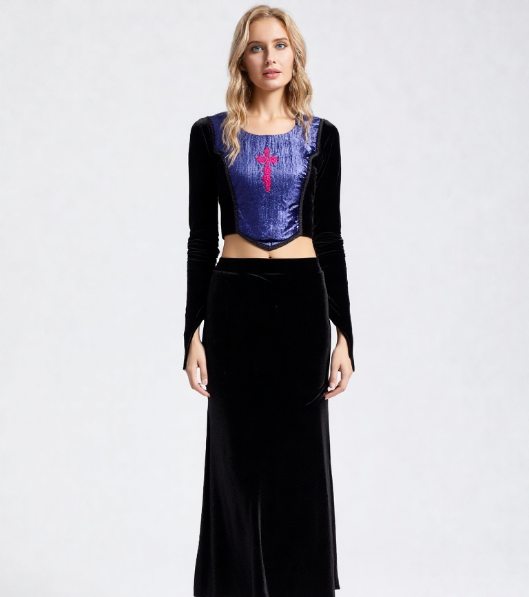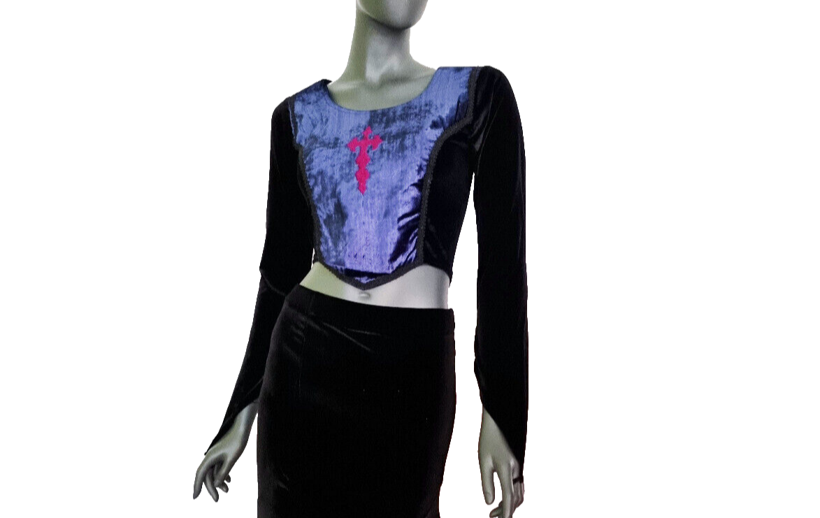 377 Verzaubern Sie Ihr Outfit mit dem Bäres Corsagen-Top im einzigartigen Gothic-Stil, das mit seinem Gothic Cross-Design und den samtigen Stulpenärmeln modisches Bewusstsein ausstrahlt. In klassischem Blau gehalten, bietet dieses Top für Damen mit Bauchfreiem Schnitt eine Kombination aus komfortabler Viskose und praktischem Reißverschluss, was es sowohl für Alltagsträgerinnen als auch für besondere Anlässe ideal macht. Die Onesize-Größe schließt eine harmonische Passform für kleinere Größen bis 38 ein, während die langen, fixierbaren Ärmel eine individuelle Gestaltung ermöglichen. Vintage-Liebhaberinnen werden die authentische Ausstrahlung dieses Kleidungsstücks zu schätzen wissen. Länge gesamt 46 cm. Brustweite 40 - 44 cm. Vorderfront verstärkt. Changierender Samteinsatz mit Gothic Cross-Stickerei. Samtärmel mit Fingerfixierung.