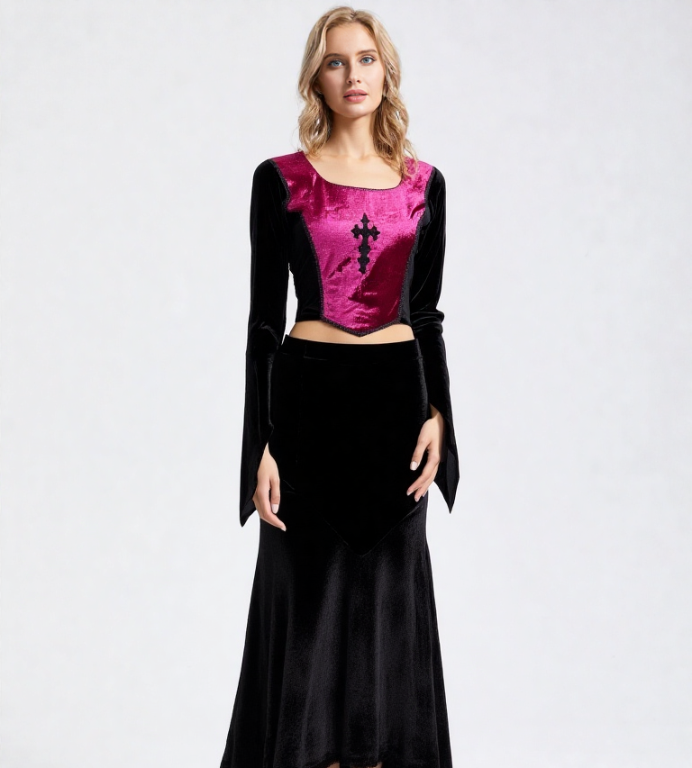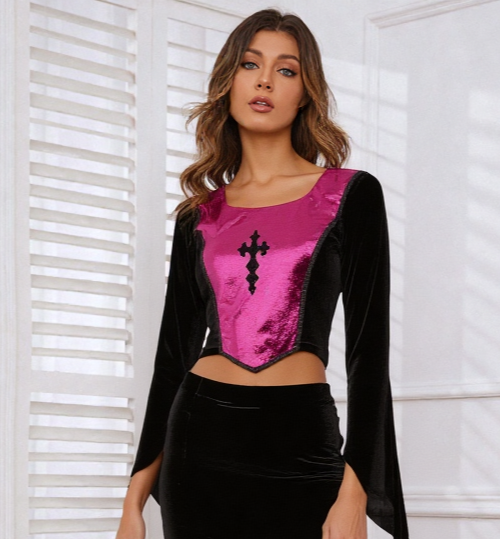377 Verzaubern Sie Ihr Outfit mit dem Bäres Corsagen-Top im einzigartigen Gothic-Stil, das mit seinem Gothic Cross-Design und den samtigen Stulpenärmeln modisches Bewusstsein ausstrahlt. In klassischem Bordeaux gehalten, bietet dieses Top für Damen mit Bauchfreiem Schnitt eine Kombination aus komfortabler Viskose und praktischem Rücken-Reißverschluss, was es sowohl für Alltagsträgerinnen als auch für besondere Anlässe ideal macht. Die Onesize-Größe schließt eine harmonische Passform für kleinere Größen bis 38 ein, während die langen, fixierbaren Ärmel eine individuelle Gestaltung ermöglichen. Vintage-Liebhaberinnen werden die authentische Ausstrahlung dieses Kleidungsstücks zu schätzen wissen. Länge gesamt 46 cm. Brustweite 40 - 44 cm. Vorderfront verstärkt. Changierender Samteinsatz mit Kreuz-Stickerei. Samtärmel mit Fingerfixierung. Hinten unifarben , schwarzer Samt .