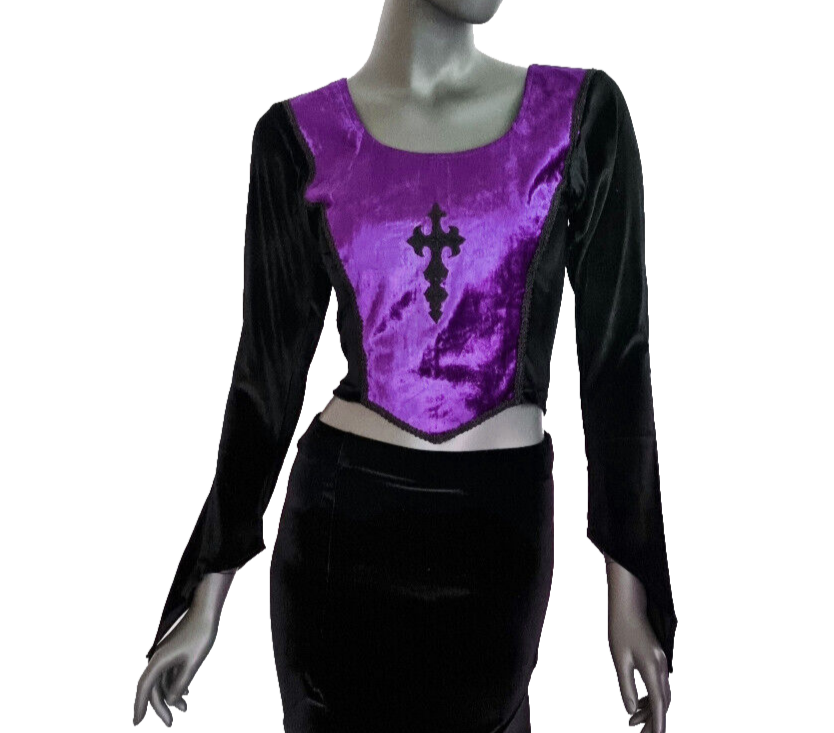 377 Verzaubern Sie Ihr Outfit mit dem Bäres Corsagen-Top im einzigartigen Gothic-Stil, das mit seinem Gothic Cross-Design und den samtigen Stulpenärmeln modisches Bewusstsein ausstrahlt. In klassischem Lila gehalten, bietet dieses Top für Damen mit Bauchfreiem Schnitt eine Kombination aus komfortabler Viskose und praktischem Reißverschluss, was es sowohl für Alltagsträgerinnen als auch für besondere Anlässe ideal macht. Die Onesize-Größe schließt eine harmonische Passform für kleinere Größen bis 38 ein, während die langen, fixierbaren Ärmel eine individuelle Gestaltung ermöglichen. Vintage-Liebhaberinnen werden die authentische Ausstrahlung dieses Kleidungsstücks zu schätzen wissen. Länge gesamt 46 cm. Brustweite 40 - 44 cm. Vorderfront verstärkt. Changierender Samteinsatz mit Kreuz-Stickerei. Samtärmel mit Fingerfixierung.