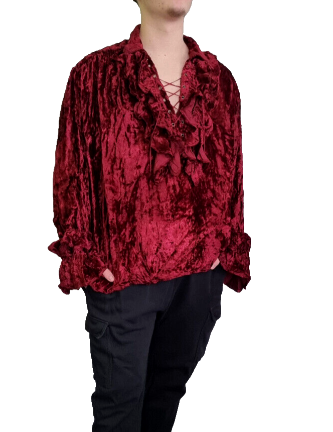 Das grosszügig geschnittene Bäres Gothic Steampunk Vintage Piraten Samthemd in bordeaux-rot ist ein stilvolles geschnürtes Hemd für Herren. Mit einer entspannten Passform und einem trendigen V-Ausschnitt ist es perfekt für den Freizeit-Look. Das Hemd aus weicher Viskose in Samt-Optik verleiht dem Outfit eine edle Note, während die Rüschen und die Schnürung für einen Hauch von Extravaganz sorgen. Perfekt für Vintage-Liebhaber und Fans von besonderen Details und Stilrichtungen. Länge ab Schulter vorn 65 cm. Hinten 75 cm.