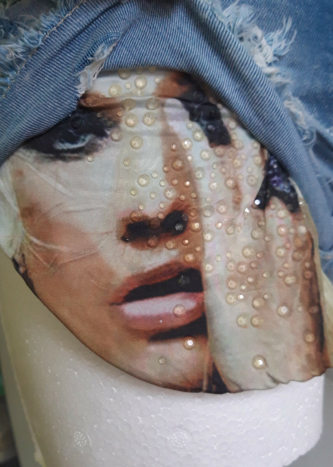 Sexy Hotpants .Tascheninlett mit Faceprint und "Wassertropfen" -Strass. 95% Baumwolle, 5% Elasthan. Seitliche Länge ca.22 cm. Schritt ca. 18 cm. Ohne Kette.