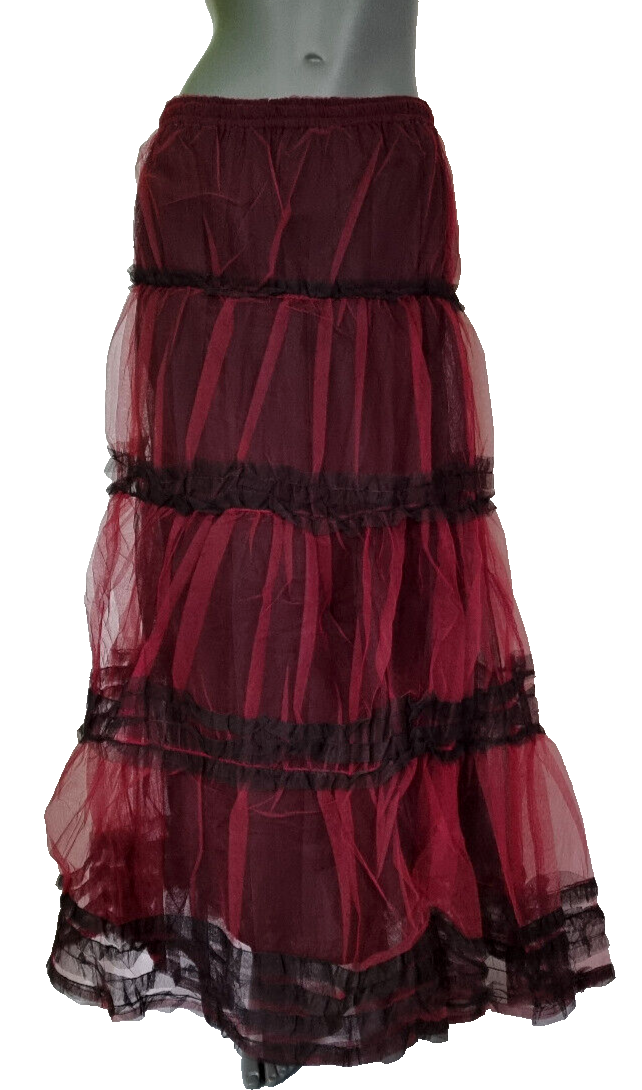 1457 Maxirock im Gothic Victorian Punk Stil mit Tüll und Stufen für Damen in der Größe 36-44. Dieser Rock in Einheitsgröße ist schwarz-rot und besteht aus Viskose. Der lange Rock hat einen variablen Bund und ist ohne Muster, perfekt für einen auffälligen Look. Ideal für Fans von alternativer Mode und Larp. Variable Bundweite von 38 bis 48 cm ! Innenzugbund. Gesamtlänge ca. 100 cm.