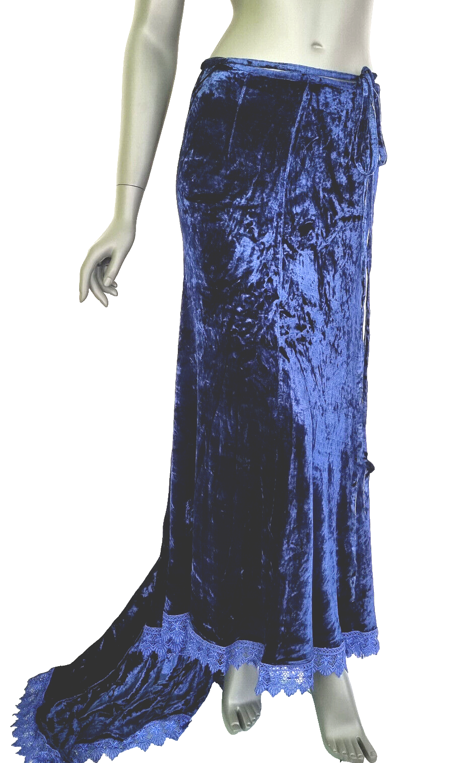 Maxirock Samtrock mit Schleppe in angesagtem Gothic Punk Design. Der Rock in Blau ist ideal für Damen in den Größen 34/36. Der lange Maxirock ist aus samtigem Material gefertigt und verleiht einen edlen Look. Der Reißverschluss sorgt für bequemes An- und Ausziehen. Perfekt für besondere Anlässe oder den Larp-Look.Bindeband individuel als Gürtel oder zum Anbinden der Schleppe. Länge 104 cm. Bundweite 34-38. Viscose, Samt. Handwäsche empfohlen.