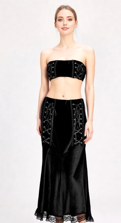 Maxirock Samtrock Corsagenrock im Gothic Witch Punk Larp Stil für Damen in Größe 34-38. Schwarzer Rock , perfekt für einen düsteren und auch edlen Look. Ein Must-Have für alle, die sich gerne extravagant kleiden und ihren individuellen Stil betonen möchten. Ideal für besondere Anlässe oder den Alltag, um sich von der Masse abzuheben und einen bleibenden Eindruck zu hinterlassen.Polyester. Länge ca.98 cm.