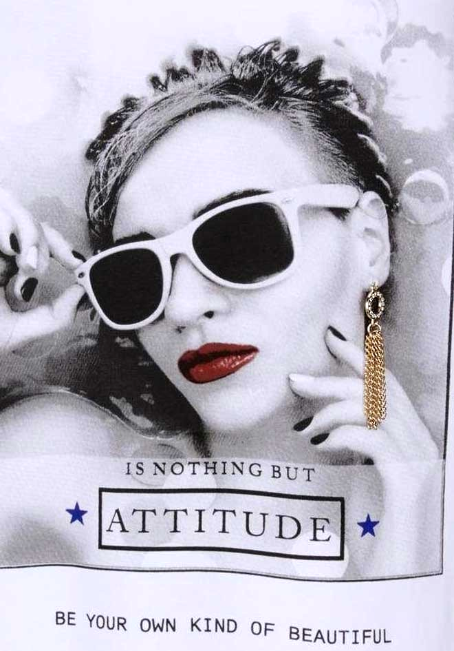 Lässt jedes Outfit erstrahlen! Das attraktive Shirt von Heine verleiht jedem Outfit das gewisse Etwas. Junger, frecher Style mit wirkungsvollem Foto-/Statementprint mit aufgesetztem, goldglänzendem, Strass-besetztem Schmuck-Element in Ohrhänger-Form vorn. Figurbetonte Silhouette mit paspeliertem Rundhalsausschnitt und kurzen Ärmeln. Länge ca. 63 cm. Trageangenehme Jersey-Qualität aus 95% Baumwolle/5% Elasthan.