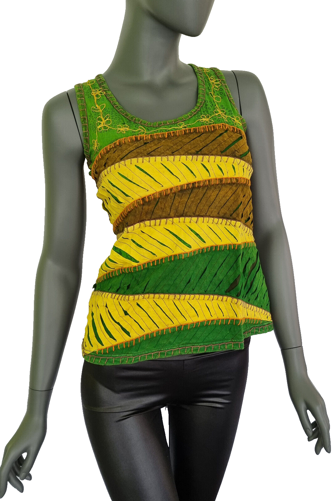 Das Razor Cut Damen Top Ethno Nepal Flower Hippie Boho in Größe 34-38 ist ein echter Eyecatcher. Das bunte Mehrfarbig-Design und die ethno-inspirierten Blumenmuster machen dieses T-Shirt zu einem Must-Have für alle Boho-Liebhaberinnen. Das T-Shirt besteht aus 100% Baumwolle und ist somit sehr angenehm zu tragen. Die Kurzarm-Ärmel und der Basic-Stil machen es zu einem perfekten Alltagsbegleiter. Hergestellt wurde es in Nepal und ist somit auch ein Fair-Trade-Produkt. Einheitsgröße. Hinten unifarben.