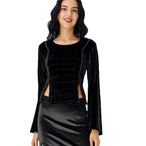 Samtshirt in Schwarz für Damen, passend für Größe 34/36 oder eine kleine 38. Dieses Langarm-T-Shirt im Gothic-Stil ist von der Marke bäres und besteht aus Viskose. Der Basic-Stil mit Rundhalsausschnitt macht es zu einem vielseitigen Kleidungsstück, das sowohl im Mittelalter-Look als auch für den Alltag getragen werden kann. Ein echtes Must-Have für alle Witchy Fashion-Liebhaberinnen. Mittelteil in Kacheloptik. 2 Schlitze am Bund.