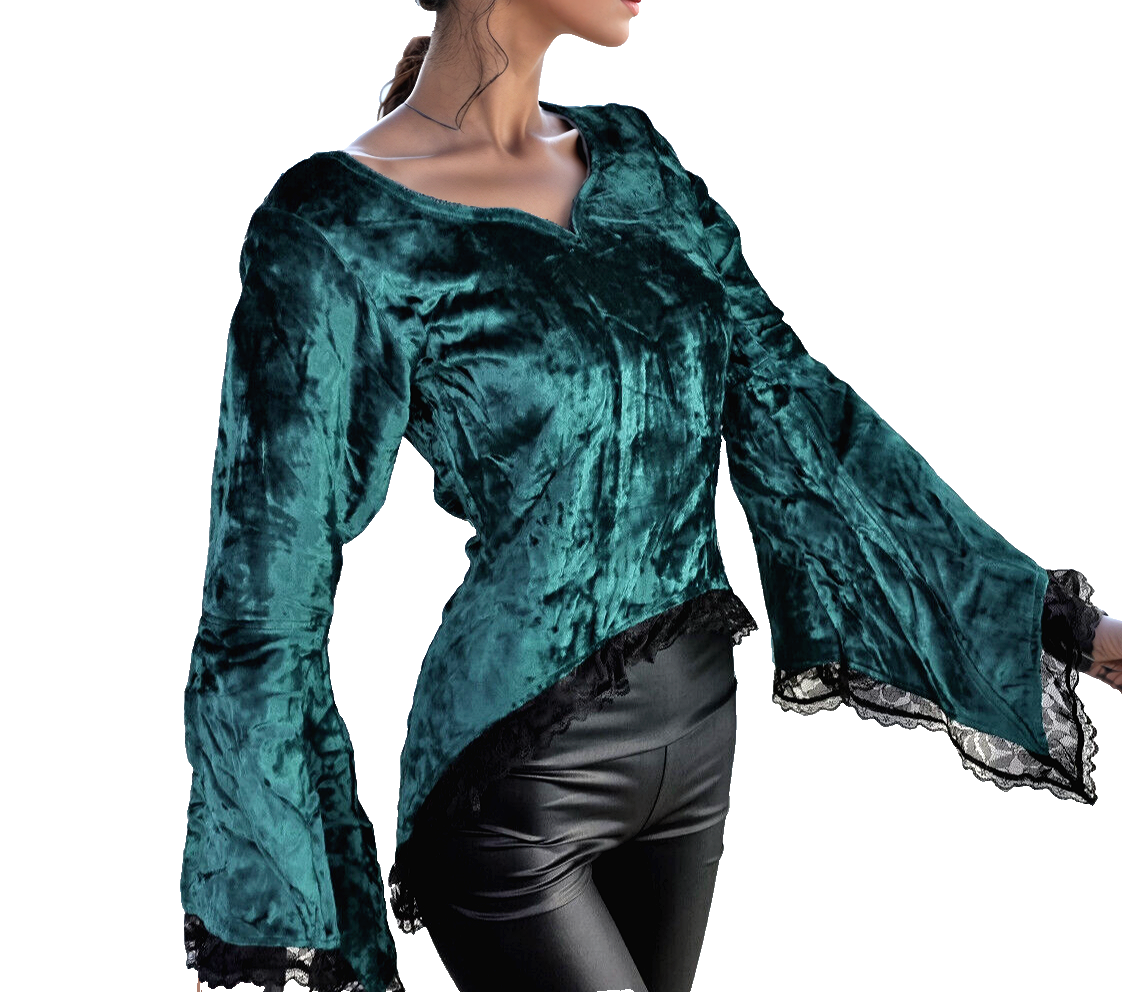 Gib deinem Look einen düsteren Touch mit dieser grünen Samttunika von bäres. Die Vokuhila-Silhouette verleiht dem Stück einen Gothic, Punk und Mittelalter-Look, perfekt für individuelle Styles. Die Bluse in Größe 34-38 besteht aus weicher Viskose, hat lange Ärmel und ist ohne Muster gestaltet. Ein einzigartiges Teil für Damen, die sich gerne außergewöhnlich kleiden. Brustweite 48 cm.